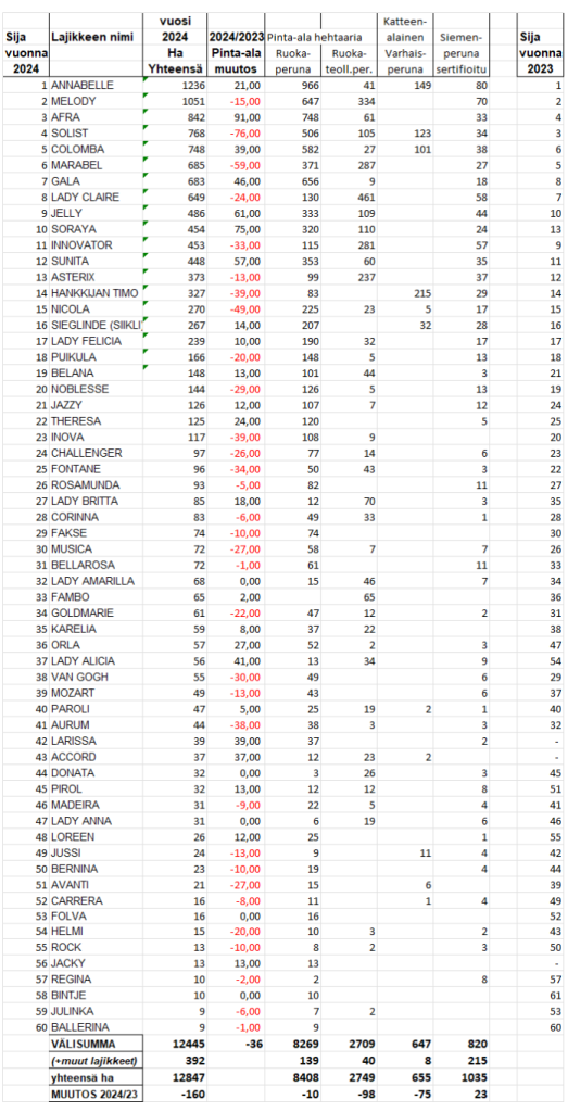 Perunan pinta-ala laski vuonna 2024 ruokaperunan osalta vajaa 200 hehtaaria ja tärkkelysperunan pinta-ala putosi 700 hehtaaria (siemenpulan vuoksi). Lajikkeista eniten nostivat pinta-alaa Afra, Soraya, Sunita, Jelly ja Gala. Eniten laskivat Solist, Marabel, Nicola, Hankkijan Timo ja Inova.