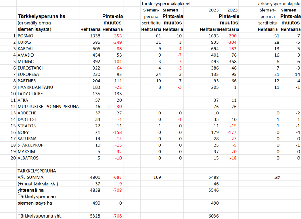Yhteensä perunan kokonaisala 19043 ha, jossa laskua 604 ha vuodesta 2022. Perunan kokonaisviljelyala on laskenut jopa 2123 ha vuodesta 2020 (21166 ha) vuoteen 2023 kolmen vuoden aikana!