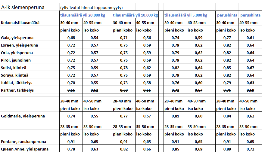 Siemenperunan hinnat on €/kg alv 0 % vapaasti myyjän varastolla Kauhajoella, Lapualla, Karviassa tai Vieremällä. Hintoihin lisätään voimassa oleva alv 14 %.