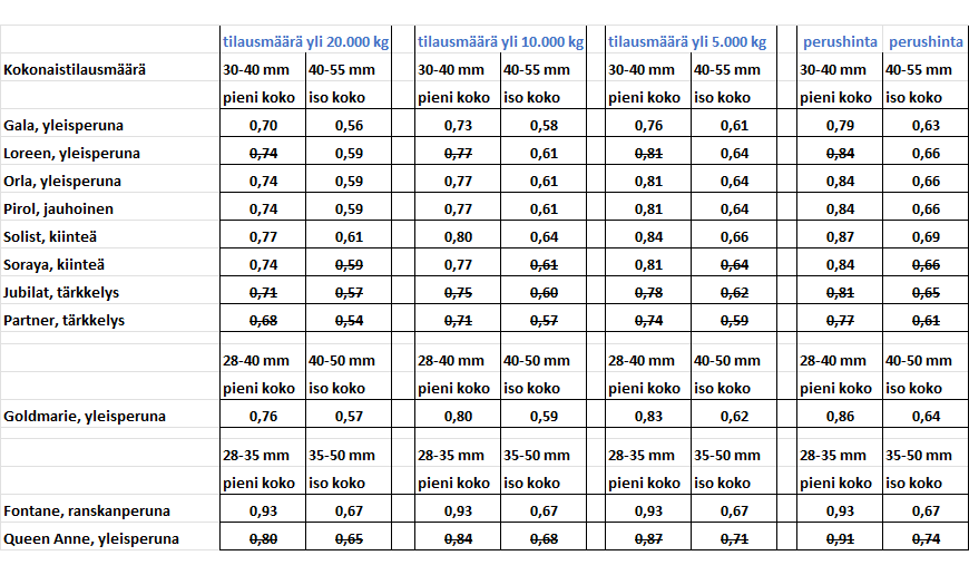 Siemenperunan hinnat on €/kg alv 0 % vapaasti myyjän varastolla Kauhajoella, Lapualla, Karviassa tai Vieremällä. Hintoihin lisätään voimassa oleva alv 14 %.