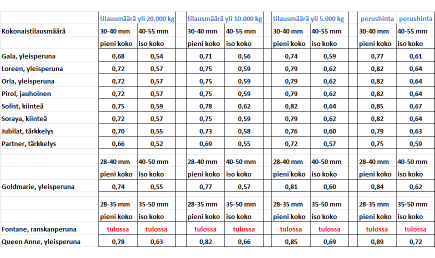Hinnat ovat 1200 kg:n suursäkkeihin pakatun siemenperunan hintoja. 600 kg suursäkeissä hinta + 0,04 €/kg. 25 kg verkkosäkeissä + 0,07 €/kg.